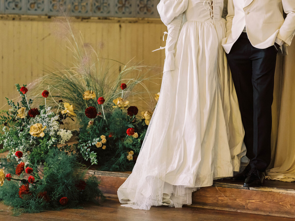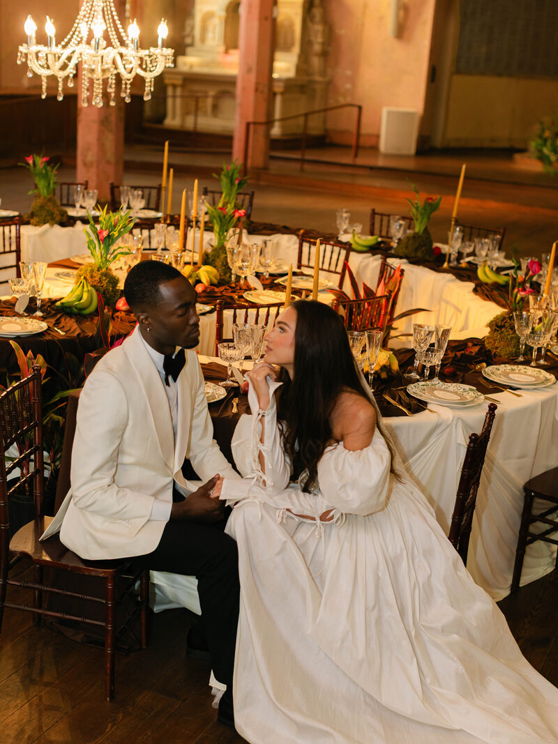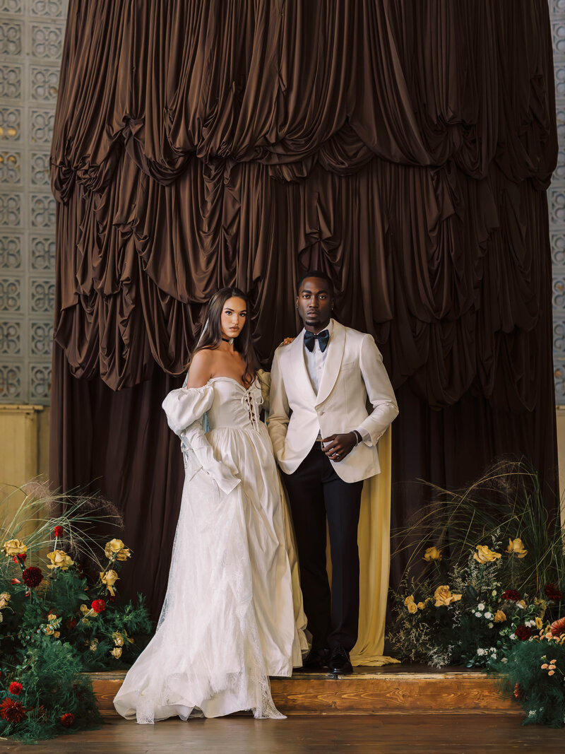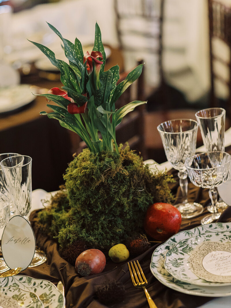 The planner envisioned an autumnal palette of dark chocolate, muted gold, and burgundy — tones that mirror the city’s heritage and the fading warmth of candlelight on old plaster. The tablescape, adorned with sculptural florals and gilded tapers, unfolds like a cinematic prayer — dramatic yet tender, grounded yet ethereal.