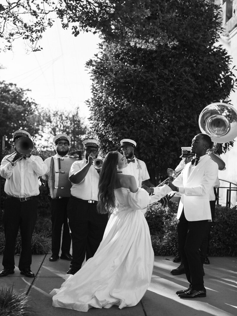 Every detail celebrates the interplay between light and shadow, romance and restraint. The bride, draped in voluminous silk and lace, becomes a living sculpture — suspended between past and present, faith and fashion. As the evening gave way to celebration, a local brass band led the couple into the streets — a joyful tribute to New Orleans’ enduring rhythm of love, life, and togetherness.
